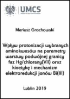 ilustracje (w tym kolorowe) ; tytuł w języku angielskim: Effects of protonation of some amino acids on the parameters of the double Hg/ chlorates(VII) interface as well as kinetics and mechanism of Bi(III) ions electroreduction ; Streszczenie w języku angielskim i polskim
