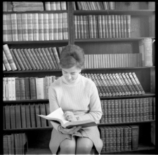 Izolda Kęsik na tle księgozbioru podręcznego czytelni czasopism